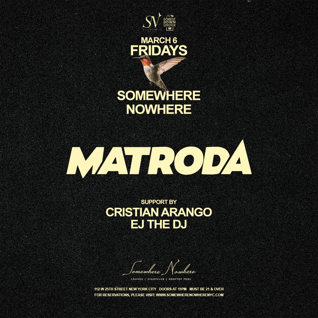 Mark your calendars: Matroda is performing live in New York City on Friday, March 6, 2026, at Somewhere Nowhere NYC. This 21+ event kicks off at 11:00 PM and features Matroda alongside support from EJ The DJ and Cristian Arango.