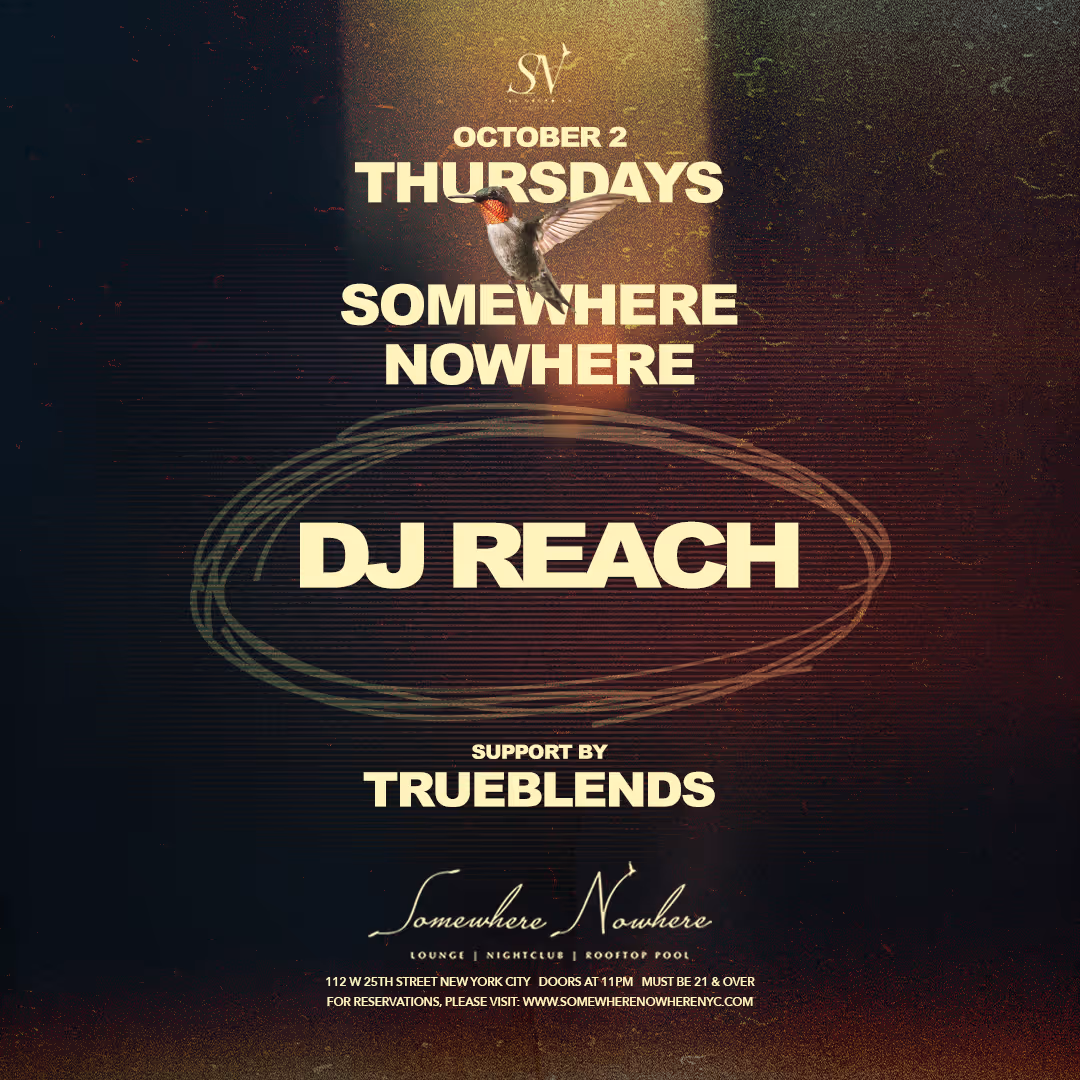 On Thursday, October 2nd, Somewhere Nowhere NYC presents Music by DJ Reach w/ Trueblends