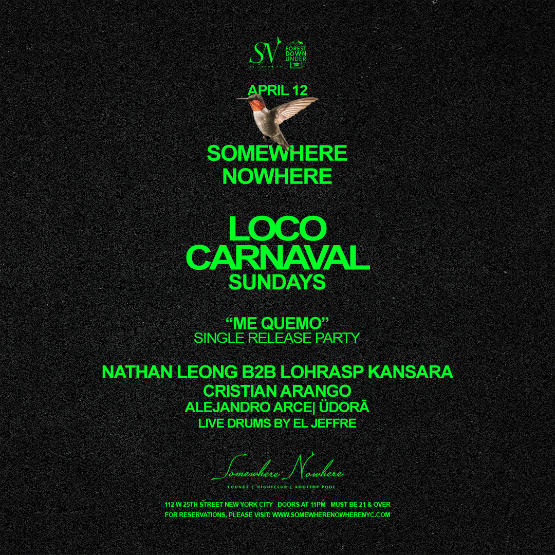 On Sunday, April 12th, Somewhere Nowhere presents Loco Carnaval Sundays with music by Nathan Leong b2b Lohrsp Kansara, and Cristian Arango.
