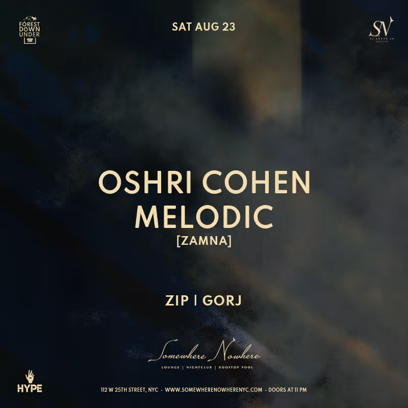 On Saturday, August 23rd, Forest Döwn Under x Hype presents Oshri Cohen x Melodic [Zamna] w/ Zip and Gorj at Somewhere Nowhere NYC.