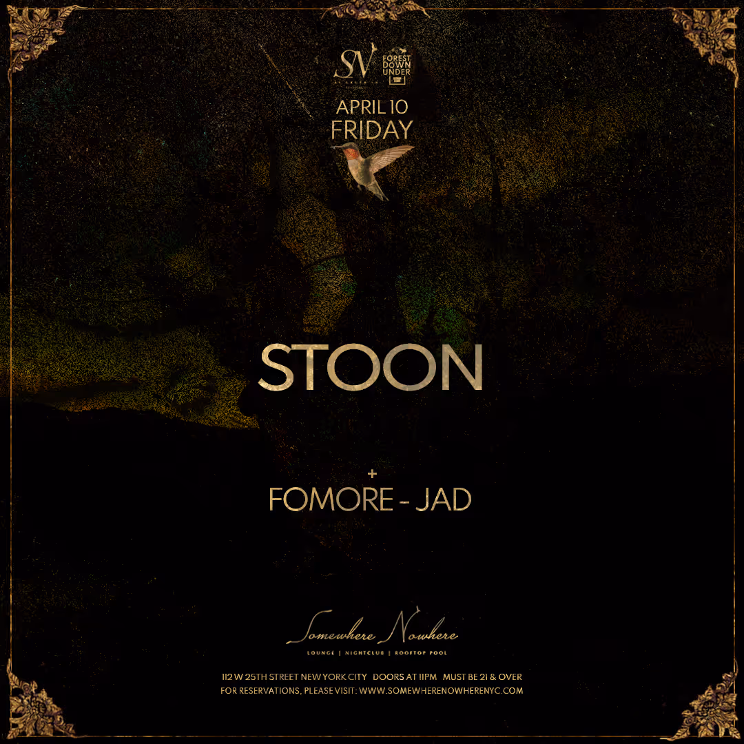 On Friday, April 10th, Somewhere Nowhere NYC presents music by Stoon, Fomore and Jad.