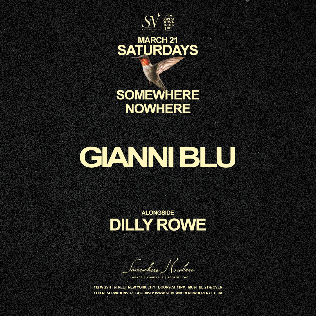 On Saturday, March 21st, Somewhere Nowhere NYC presents music by Gianni Blu w/ Dilly Rowe