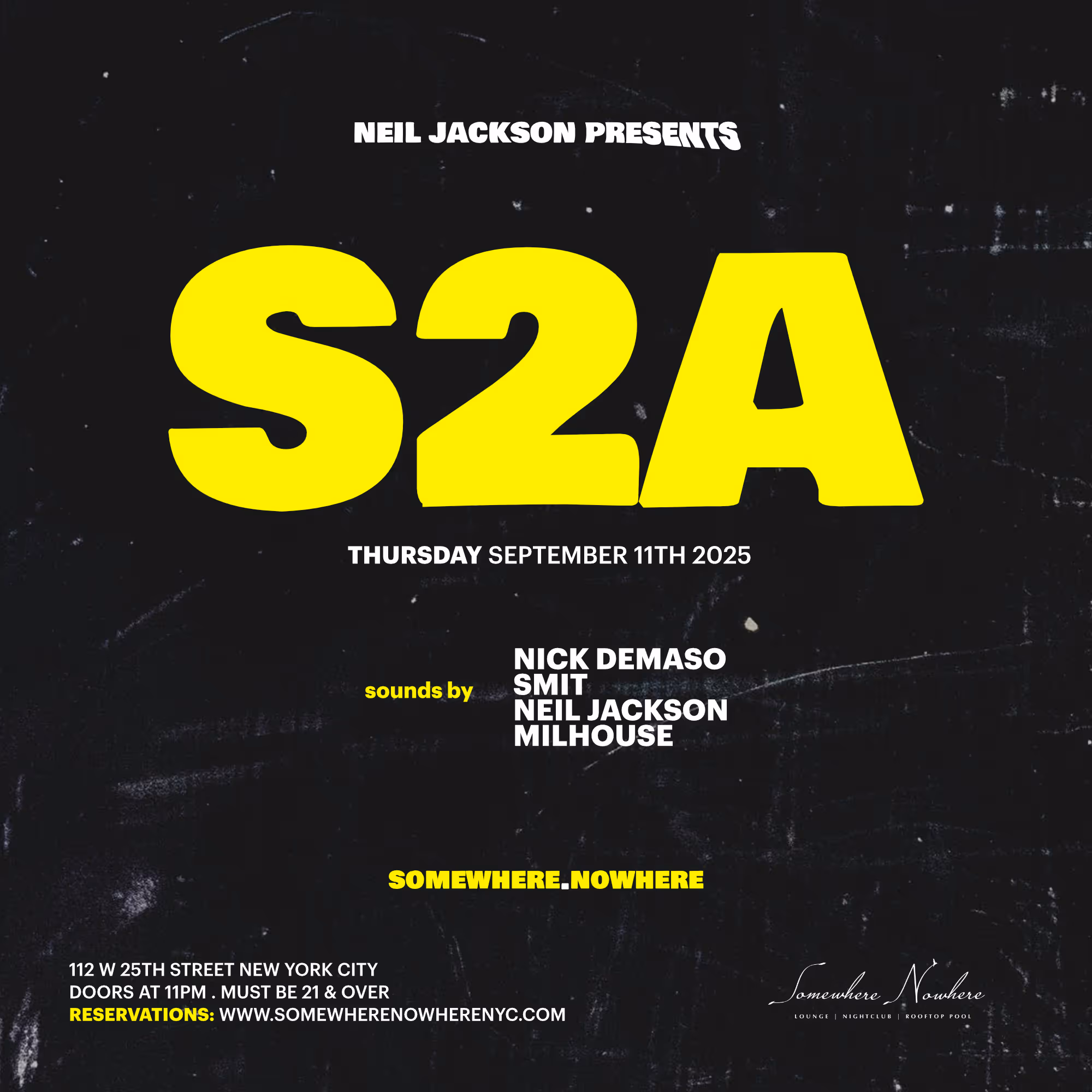 On Thursday, September 11th, Somewhere Nowhere NYC x Neil Jackson Presents: S2A with Music by Nick Demaso, neil Jackson, Milhouse, Smit.