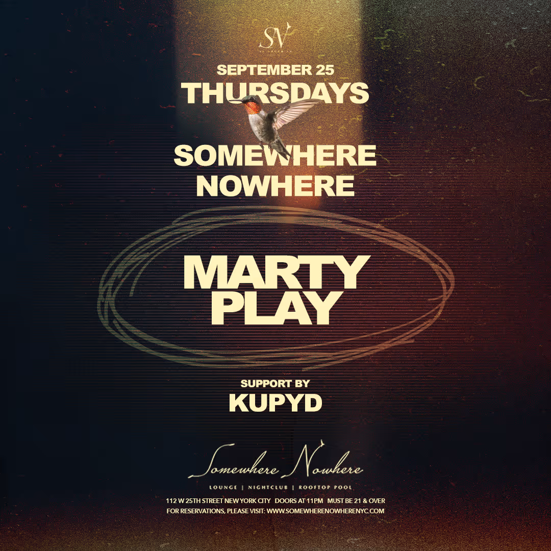 On Thursday, September 25th, Somewhere Nowhere NYC presents Where Else Thursdays with Music by Marty Play w/ Kupyd